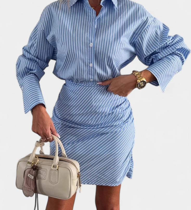 Cynthia Vestido Camisero Mini a Rayas con Pliegues y Botones